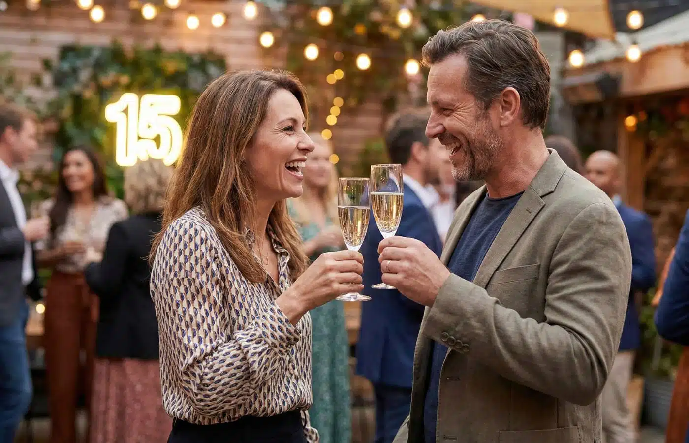 Touche cristal : pluie de confettis holographiques à minuit (facile à nettoyer).Jeux & défis “15” : quiz “15 questions sur notre couple”, photomimes de films, blind test “cristal” (titres avec “light/clear”).