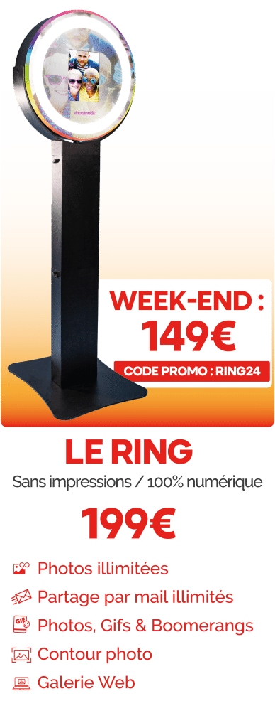 La location de borne photo à Antony modèle Ring, notre modèle le plus écologique ! 100% numérique, donc zéro impression de papier.