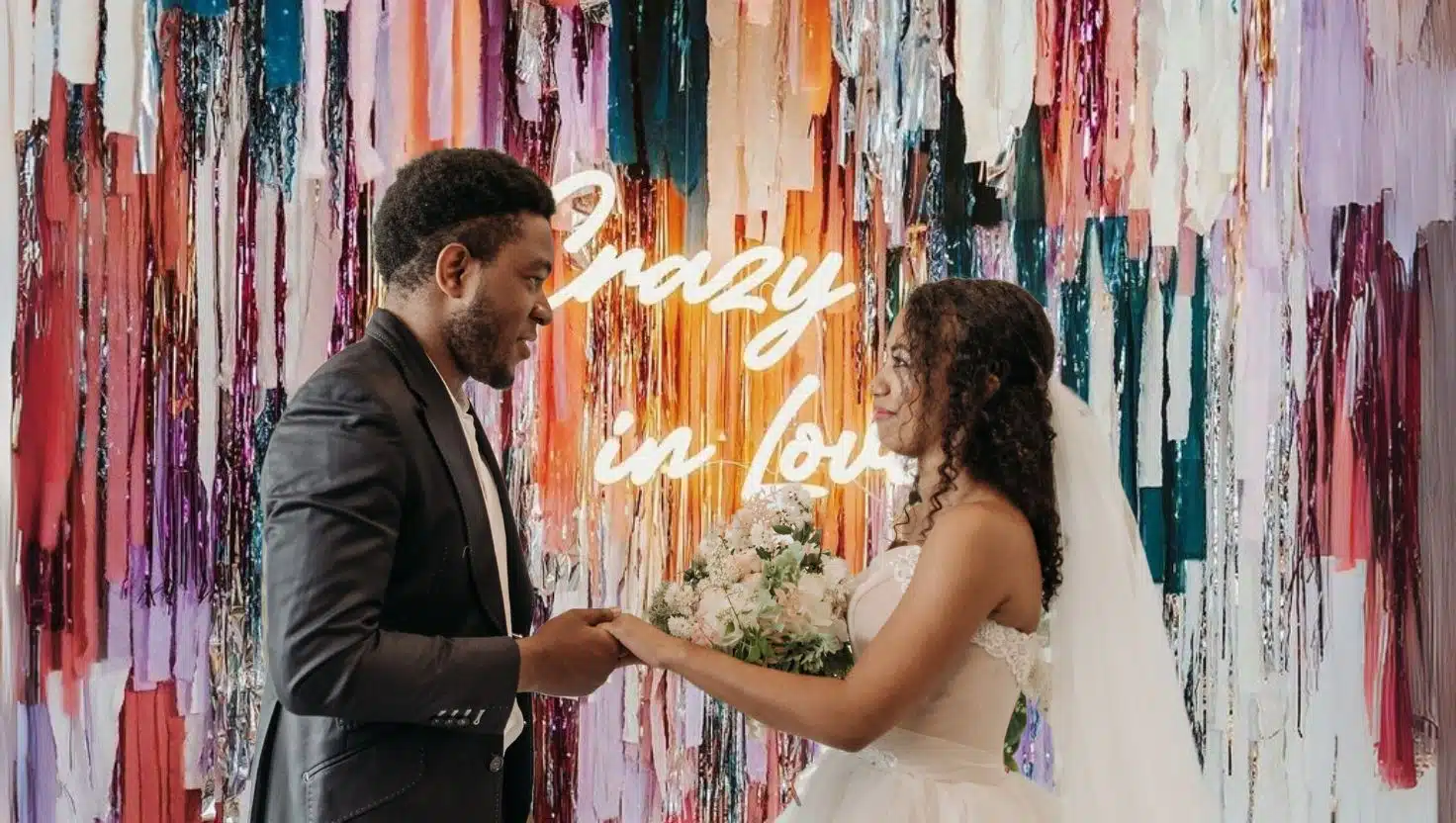 - Photocall avec rideau de confettis ou Mur de rubans en cascade : Les confettis ou les rubans créent un effet visuel élégant et festif, ajoutant de la joie et de l’éclat aux clichés. Pour le fabriquer, vous pouvez découper ou acheter des confettis en papier de différentes couleurs et les attacher à une ficelle ou à un fil. Vous pouvez également trouver des rideaux de confettis prêts à l’emploi dans les magasins de décoration de mariage